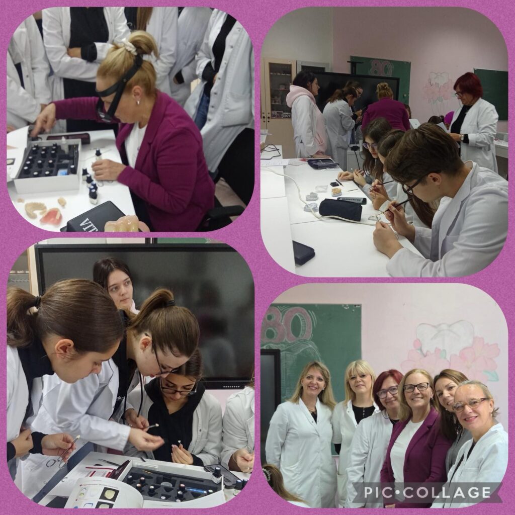 Kao dio edukacije demonstrirana je i praktična primjena materijala VITA AKZENT LC, kroz individualizaciju kompozitne nadoknade svjetlosnopolimerizirajućim bojama. Učenici II-1 i III-3 odjeljenja mogli su iz prve ruke vidjeti kako se postiže visoka estetika i prirodnost protetske nadoknade, što je ključno u modernoj protetici.
