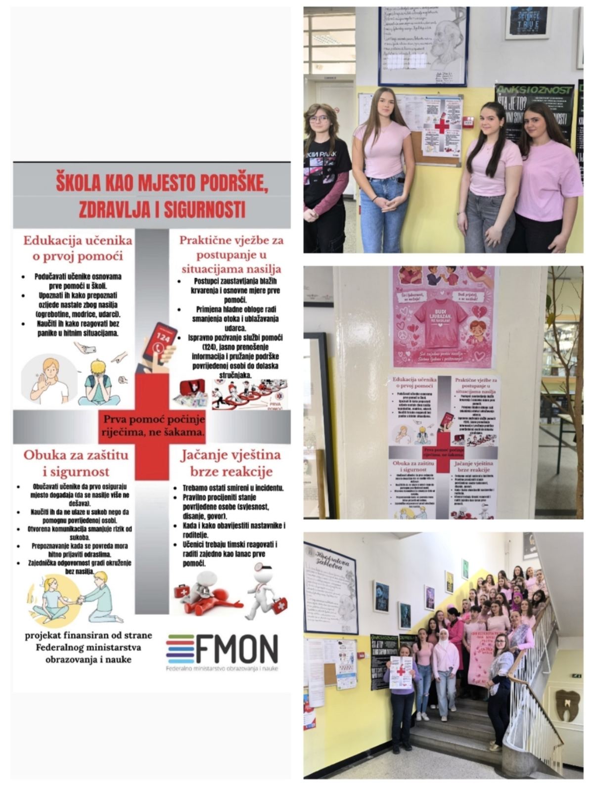 Kroz sekciju Prve pomoći, u okviru projekta “Škola kao mjesto podrške, zdravlja i sigurnosti”, koji finansira Federalno ministarstvo obrazovanja i nauke (FMON), učimo mlade ne samo kako da pruže pomoć kod fizičkih povreda, već i kako da prepoznaju i reaguju na emocionalnu bol svojih vršnjaka.